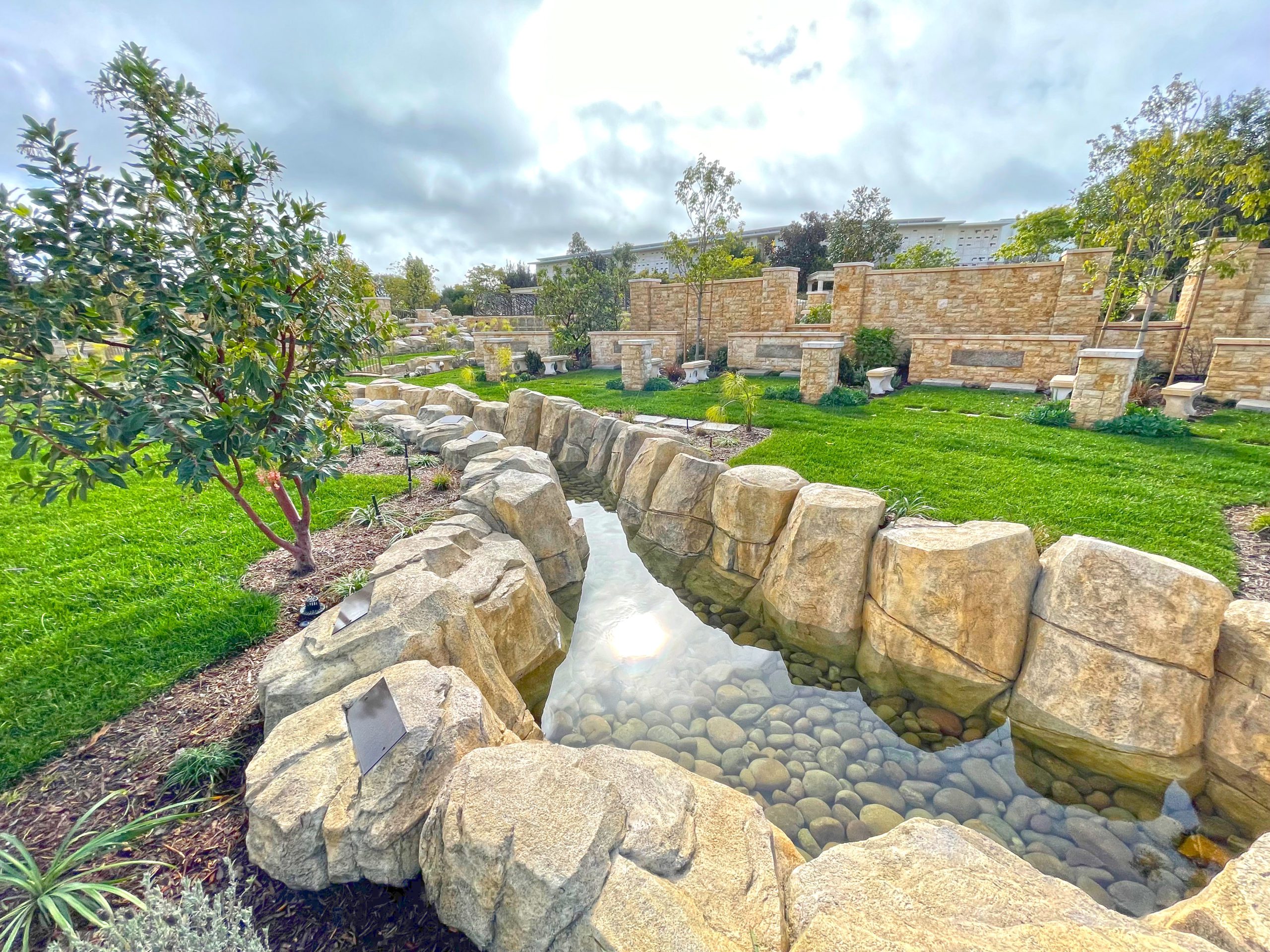 Several retaining walls were designed and built with bridge-like recesses such that the water features appear to pass through and underneath the walls and exit on the other side. This method enables the water to look as if it is continuously flowing through the structure, when in reality we created two completely separate water systems. As the park is the burial spot of numerous Hollywood stars, one of the cascades even flows by the final resting spot of Leonard Nimoy (Mr. Spock of Star Trek fame).
